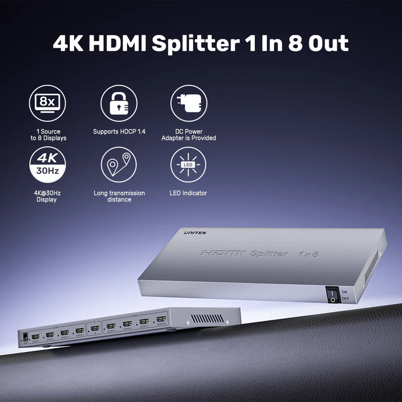 Experience seamless connectivity with the UNITEK 4K HDMI Splitter, designed to split a single HDMI input source into 8 identical outputs without any loss of video or audio quality. This powerful splitter is perfect for extending multiple displays in conference rooms, healthcare centers, retail storefronts, and more.