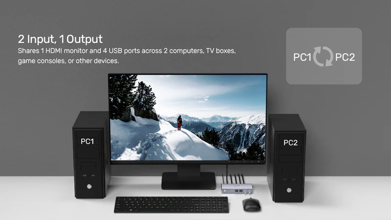 Optimize your workspace with the UNITEK HDMI KVM Switch, designed to share one HDMI monitor and four USB ports between two computers, TV boxes, game consoles, and more. With a simple one-click swap, you can instantly switch between devices with ease.