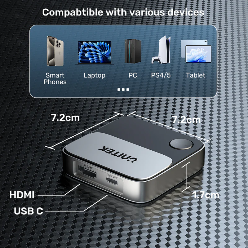 Compact size (7.2 x 7.2 x 1.7cm) to bring along and use on the go. With no messy cables to deal with and low power consumption, this device is perfect for use in business meetings, classrooms, travels or other entertainment scenarios. Streamline your connectivity and take your multimedia experience to the next level with this compact and efficient device.