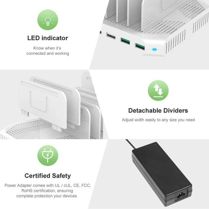 1. Multiple USB Charger station: Charges up to 10 USB powered devices simultaneously, support 8 iPads at once. Hold your USB devices all in one place.